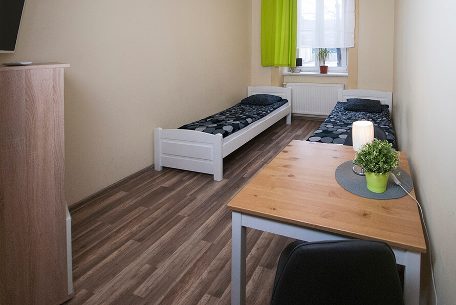 Przytulny pokój dla dwóch osób, który zadba o komfortowy pobyt za sprawą dwóch pojedynczych, wygodnych łóżek. W pomieszczeniu znajduje się także stolik z dwoma krzesełkami oraz szafki przydatne do przechowania najpotrzebniejszych rzeczy. Na ścianie wisi telewizor z dostępem do telewizji kablowej.