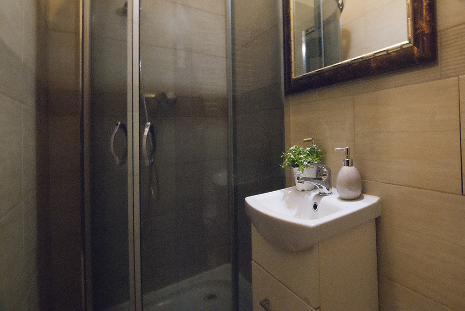 Pokój dysponuje własną łazienką wyposażoną w WC, prysznic oraz umywalkę, pod którą znajduje się szafka umożliwiająca przechowanie kosmetyków.