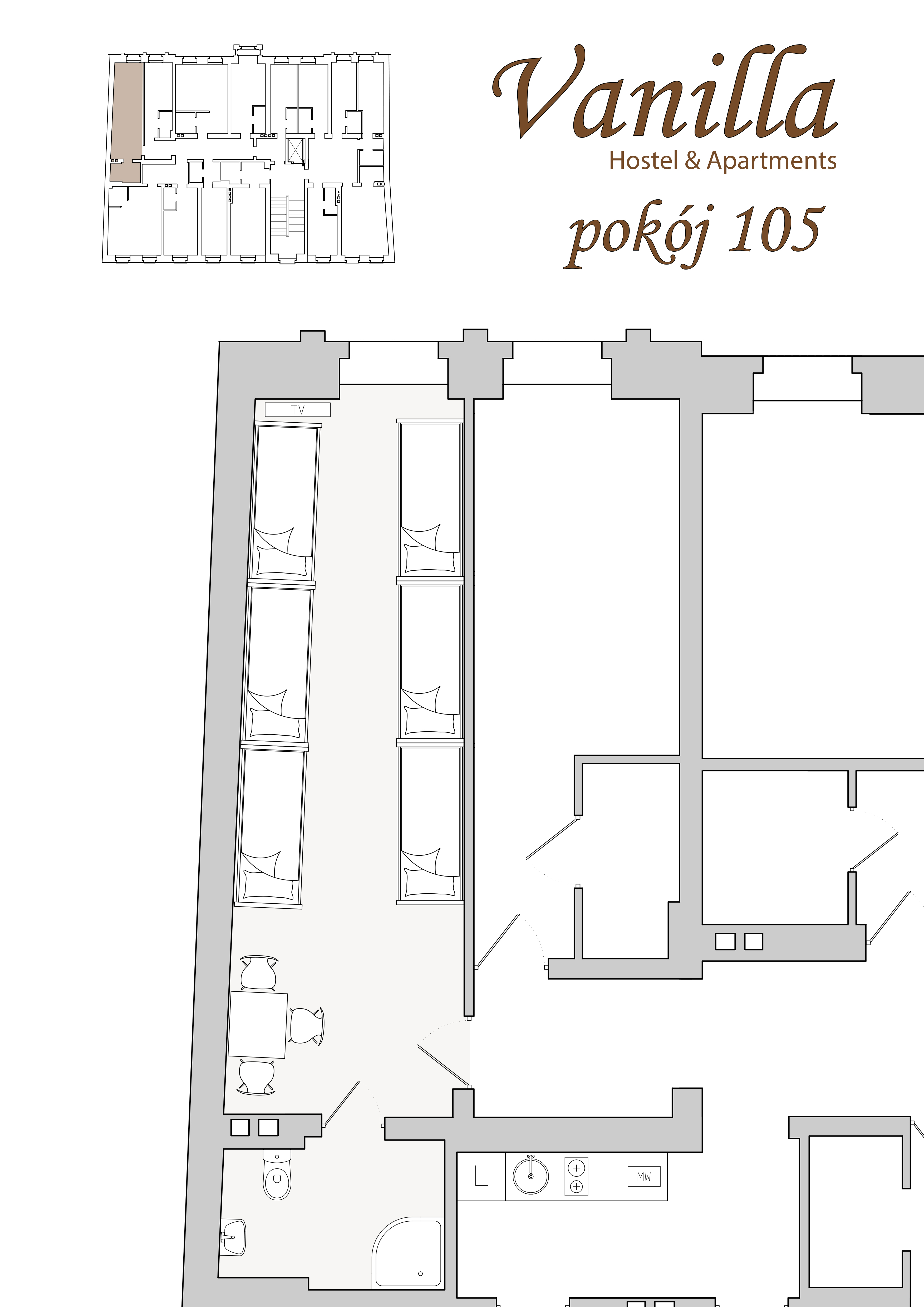 Duży, widny pokój utrzymany w klimacie charakterystycznym dla Vanilla Hostel. Przystosowany do komfortowego pobytu 6 osób za sprawą wygodnych, pojedynczych łóżek oraz stolika z krzesłami. Na ścianie wisi duży telewizor oraz komoda – idealna do przechowania najpotrzebniejszych rzeczy.