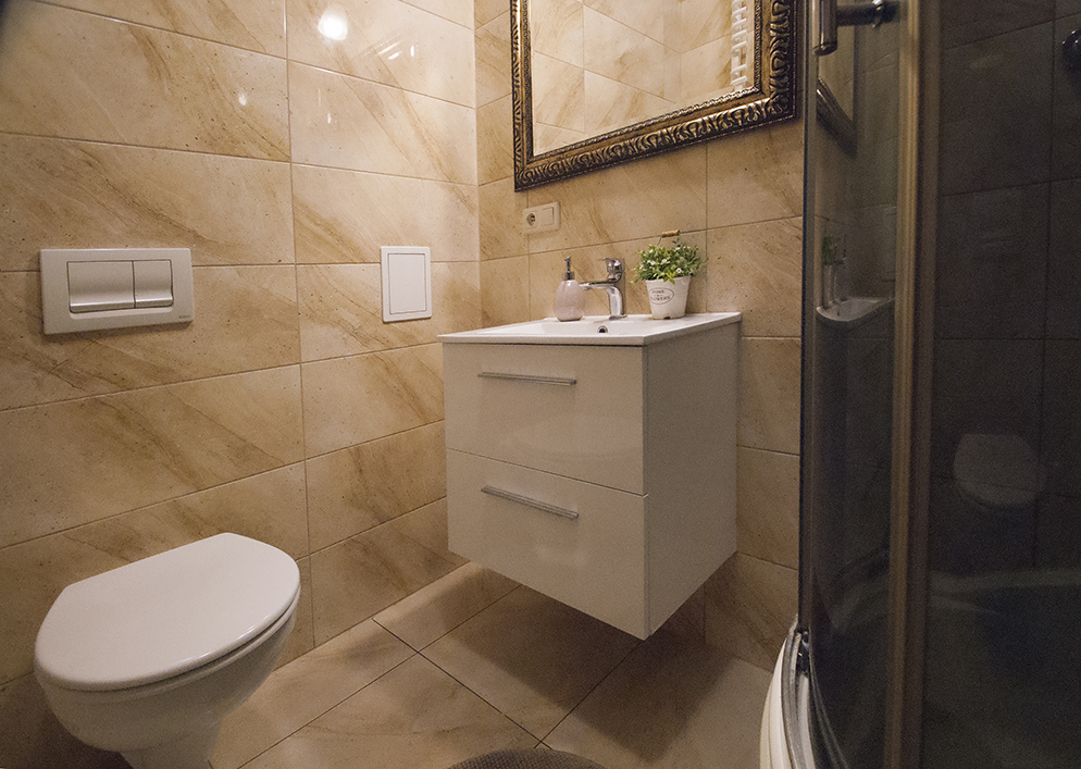 Pokój posiada własną łazienkę wyposażoną w dużą kabinę prysznicową, WC oraz umywalkę, pod której znajduje się szafka – idealna do przechowania kosmetyków. 4-osobowy pokój z łazienką to idealny nocleg dla rodziny z dziećmi blisko centrum Wrocławia.