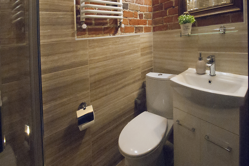 W pokoju znajduje się własna łazienka wyposażona w dużą kabinę prysznicową, umywalkę oraz WC.