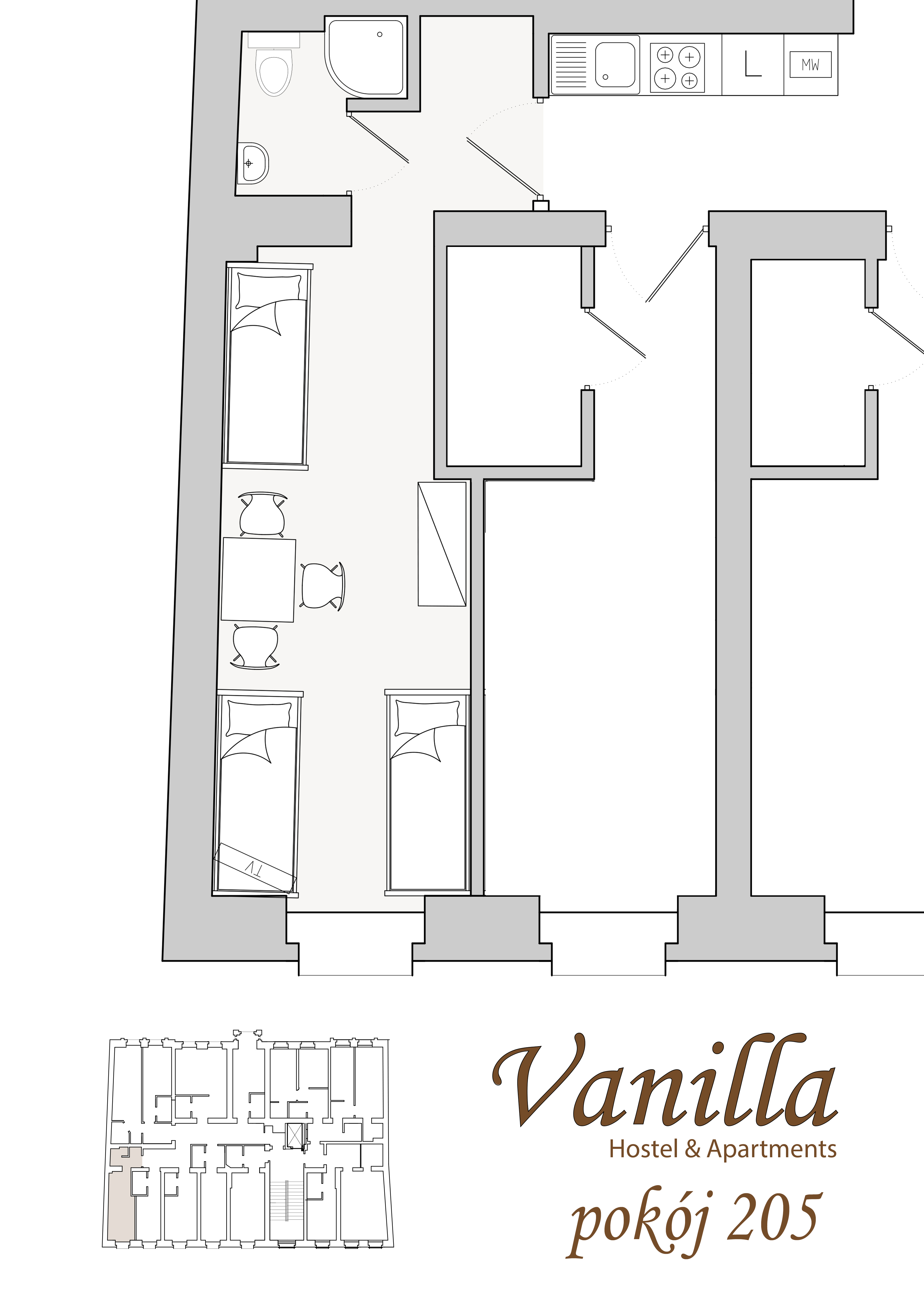 Pokój utrzymany w stylu loft. Idealny dla 3 osób, które wygodnie przenocują na 3 pojedynczych łóżkach. W pomieszczeniu znajduje się również stolik z trzema krzesełkami – idealny do wspólnego spędzenia wolnego czasu. Naszym gościom udostępniamy również szafkę do przechowywania najpotrzebniejszych rzeczy.