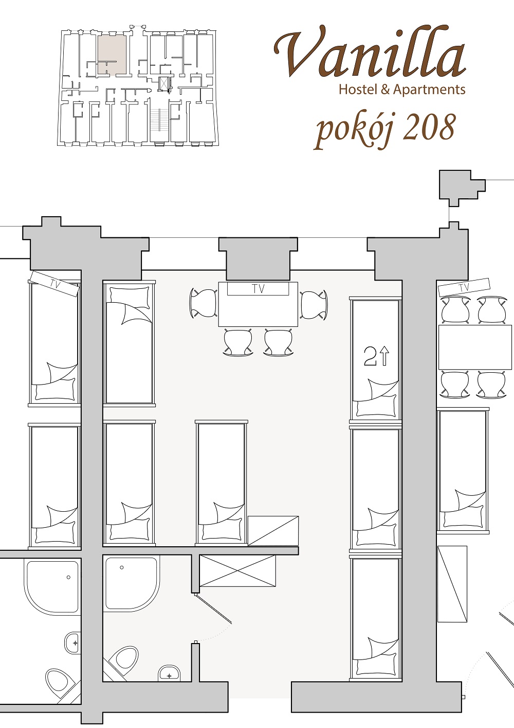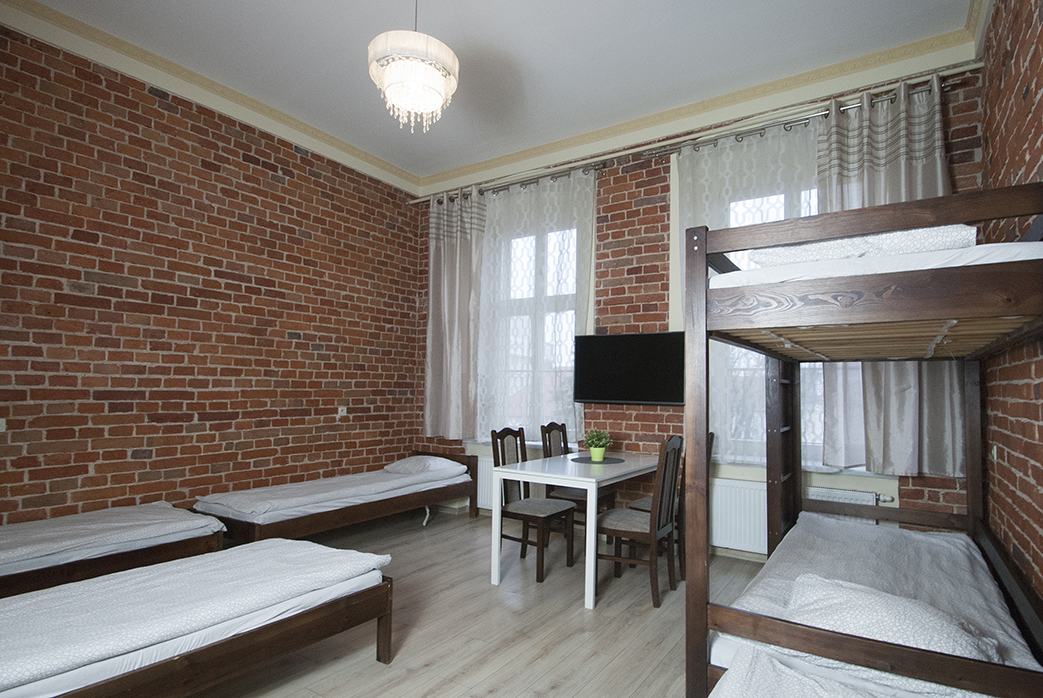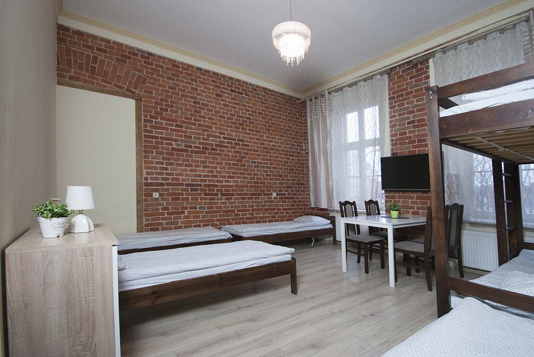 Pokój idealny dla większej grupy lub pracowników. Zapewni komfortowy nocleg dla 7 osób. Zawiera jedno łóżko piętrowe oraz 5 pojedynczych. Na ścianie wisi duży telewizor z dostępem do telewizji kablowej. Pod nim postawiliśmy stół oraz 4 krzesła, by mogli Państwo zjeść wspólny posiłek lub spędzić razem czas wolny.