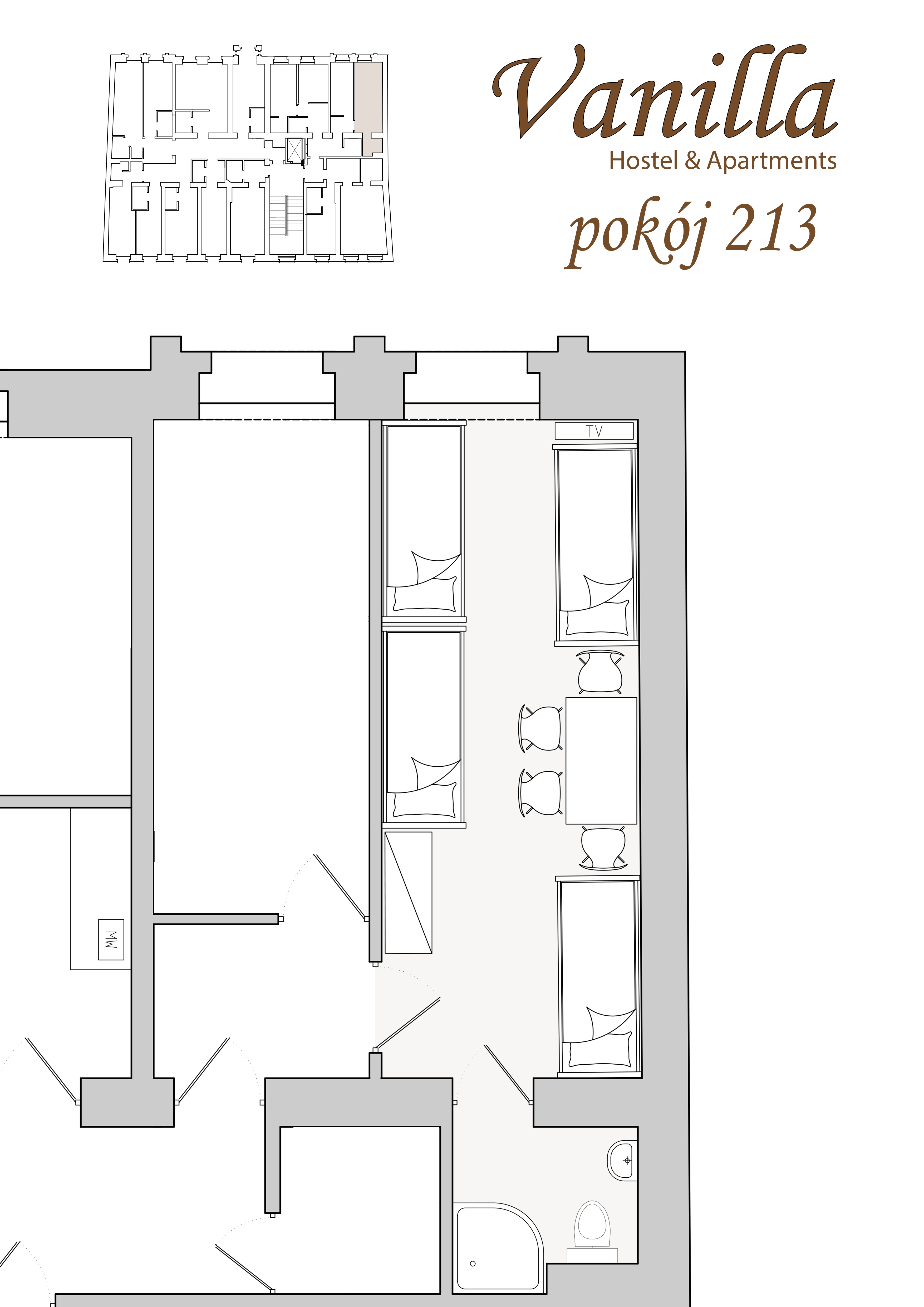 Pokój z łazienką dla 4 osób wyposażoną w dużą kabinę prysznicową, toaletę oraz umywalkę. Obok znajduje się wspólny aneks kuchenny wyposażony w podstawowe naczynia oraz sprzęt niezbędny do samodzielnego przygotowania posiłków – lodówkę, mikrofalówkę, kuchenkę oraz czajnik.