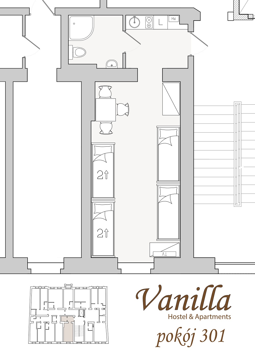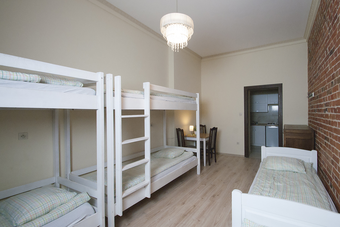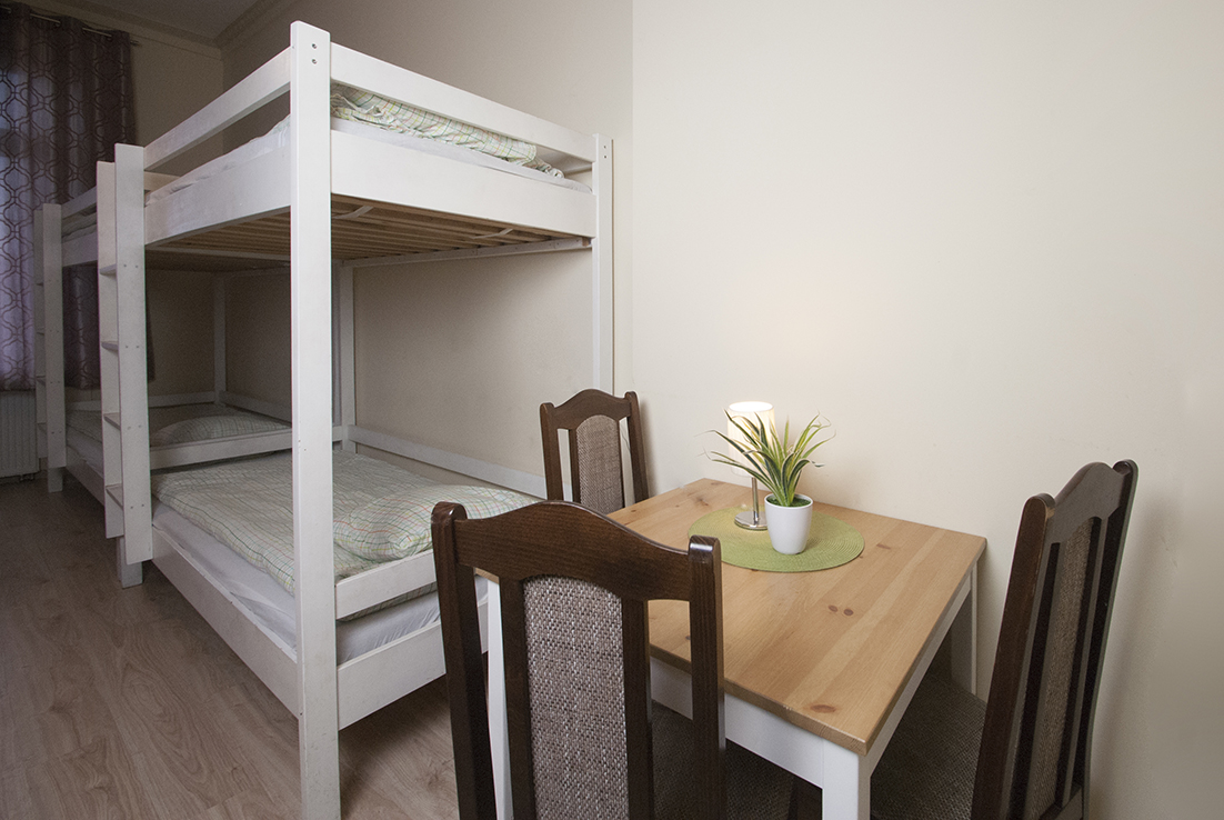 Duży, przestrony pokój, który zadba o komfortowy pobyt 6 osób. Dysponuje on dwoma piętrowymi oraz dwoma pojedynczymi, wygodnymi łóżkami. W pomieszczeniu znajduje się również stolik, przy którym usiądą trzy osoby. Do dyspozycji gości oddajemy również komodę, która umożliwi przechowanie bagażu.