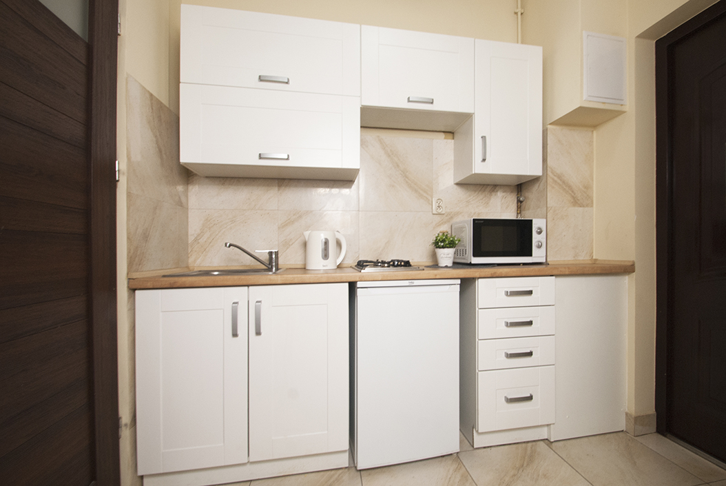 Pokój posiada dostęp do aneksu kuchennego wyposażonego w czajnik, kuchenkę, mikrofalówkę oraz lodówkę. Łazienka utrzymana w nowoczesnym aczkolwiek gustownym stylu. Zawiera kabinę prysznicową, umywalkę oraz toaletę. Apartament dla 6 osób to idealny nocleg z własną kuchnią i łazienką dla rodziny, grupy znajomych czy pracowników.
