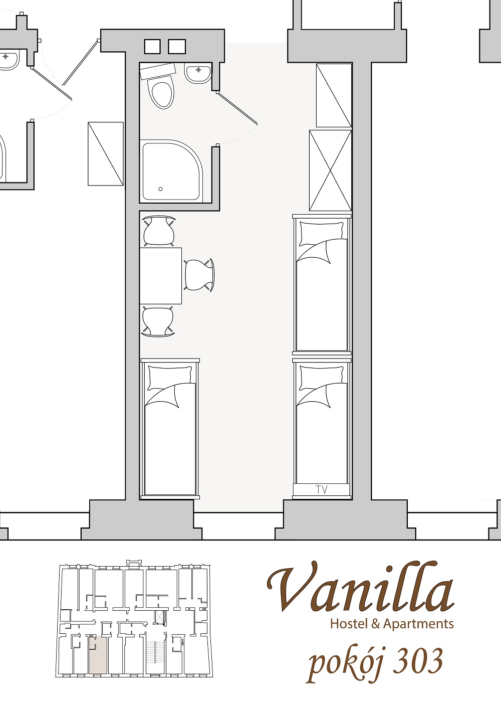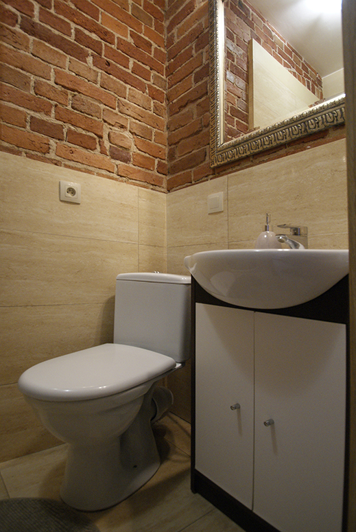 Przestronny, schludny pokój dla 3 osób. Utrzymany w ceglanej stylistyce, typowej dla Vanilla Hostel&Apartments. Zyskuje dzięki temu niepowtarzalny klimat.