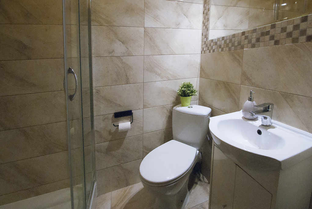 Pokój posiada łazienkę wyposażoną w kabinę prysznicową, WC oraz umywalkę. Obok znajduje się wspólny aneks kuchenny zawierający podstawowe naczynia oraz sprzęt potrzebny do przyrządzenia posiłku – lodówkę, czajnik, kuchenkę oraz mikrofalówkę. Nasz pokój 3-osobowy z łazienką blisko centrum Wrocław to idealna opcja dla grupy znajomych lub rodziny z dzieckiem.