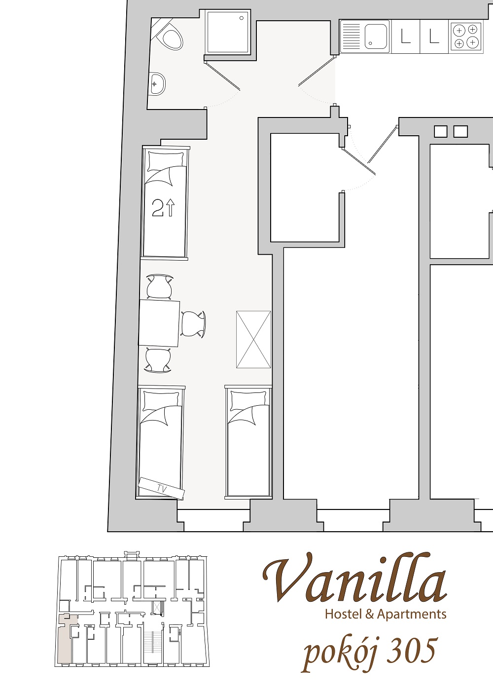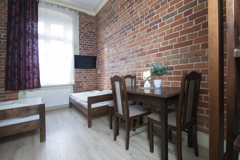 Pokój nr 305 to duże, jasne pomieszczenie, które komfortowo przenocuje 4 osoby. Dysponuje jednym piętrowym oraz dwoma pojedynczymi łóżkami. Nasi goście mogą wspólnie spędzić czas przy stoliku, przy którym mogą zasiąść 4 osoby.