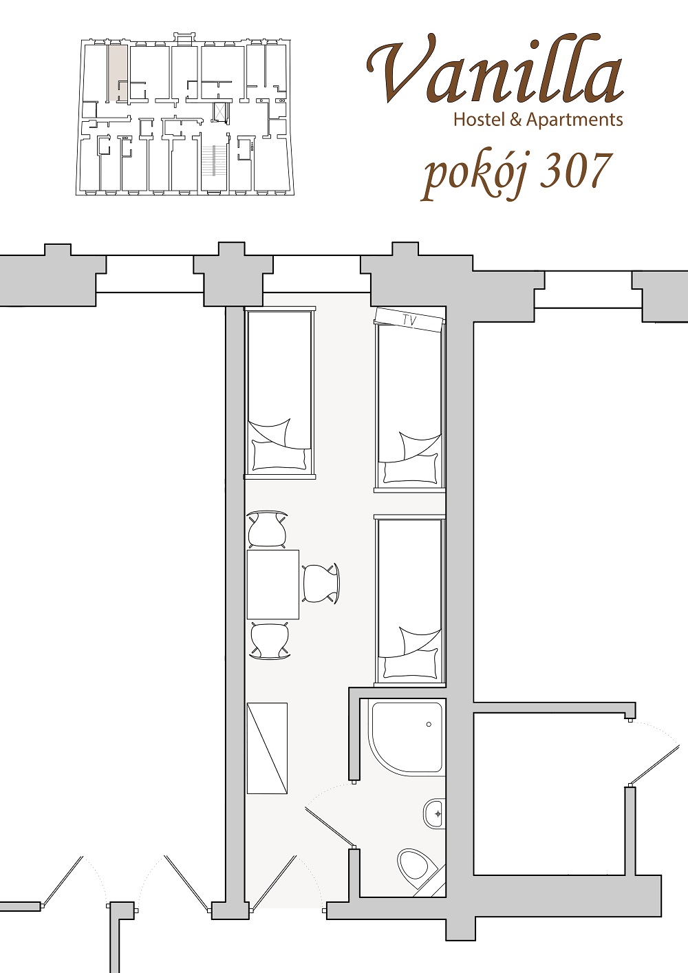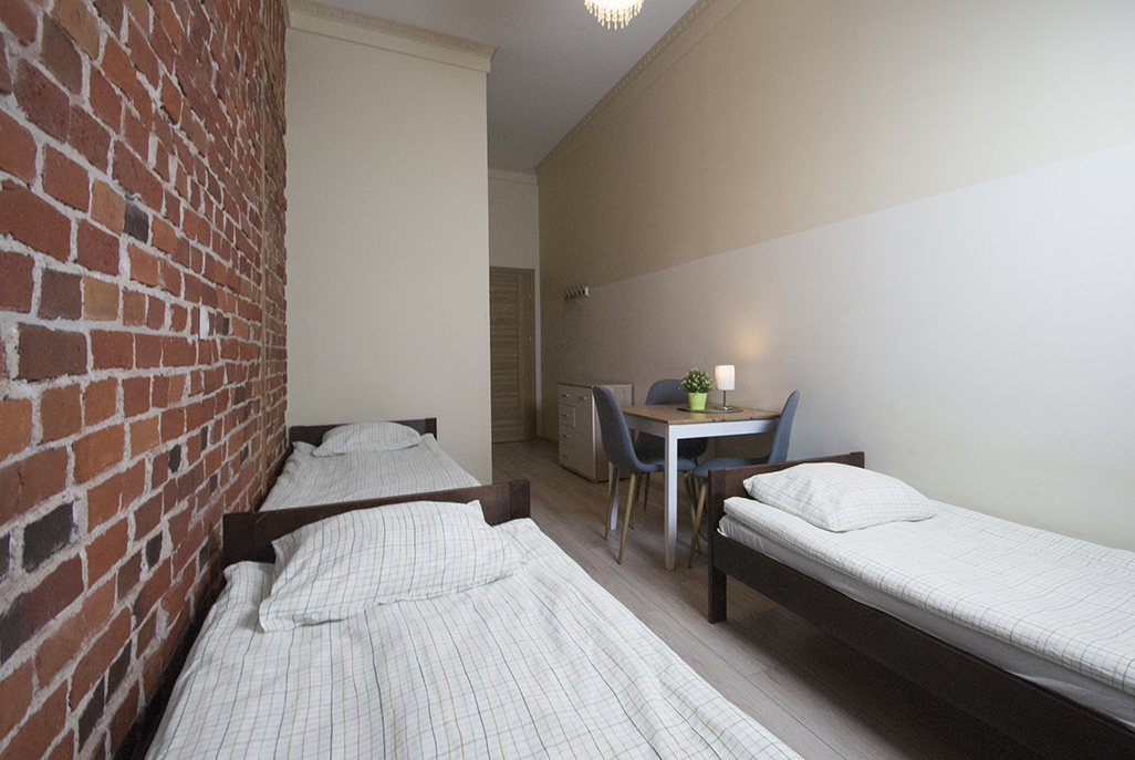 Przytulny pokój, który w komfortowych warunkach przenocuje 3 osoby w 3 pojedynczych łóżkach. Posiada również stolik z trzema krzesłami oraz telewizor. Pomimo tego, że pokój jest dość niewielki – wpada do niego dużo światła dziennego za sprawą sporego okna.